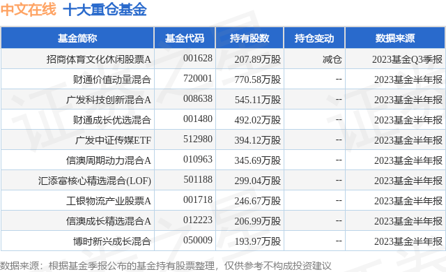 根据2023基金Q3季报公募基金重仓股数据,重仓该股的公募基金共1家,其中持有数量最多的公募基金为招商体育文化休闲股票A。招商体育文化休闲股票A目前规模为5.42亿元,最新净值1.279(10月23日),较上一交易日下跌3.33%,近一年上涨5.97%。该公募基金现任基金经理为文仲阳。文仲阳在任的基金产品包括:招商境远灵活配置混合,管理时间为2020年5月20日至今,期间收益率为13.95%;招商国企改革主题混合基金,管理时间为2021年2月9日至今,期间收益率为-36.05%;招商安弘灵活配置混合,管理时间为2022年1月14日至今,期间收益率为-35.32%。