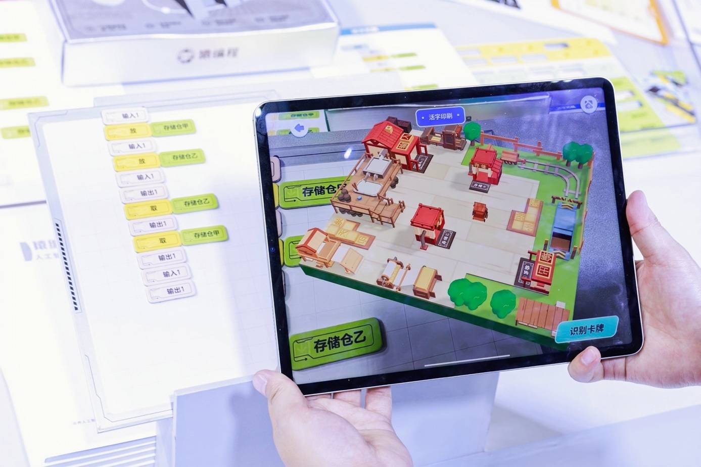展会上,一堂“传统工艺”《活字印刷》课格外引人注目。工作人员用电子设备扫描实物指令卡,一个生动立体的“印刷工坊”随即出现在眼前的大屏幕上。场景中,机器人正依照先前摆放的指令卡步骤,将乱序活字以正确顺序搬运到输出口。据介绍,这是猿编程独家研发的AR编程新系列——AR编程算法基础,此次首度在教育装备展上展示。