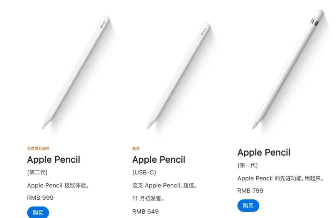至于新款Apple Pencil相比一代笔和二代笔移除了压感功能,所以价格也比前两代笔便宜一点,采用哑光饰面和平坦侧面设计,可磁力吸附在 iPad 侧面,进入休眠状态并节省电量,使用USB-C连接线进行配对与充电,支持所有C口ipad。