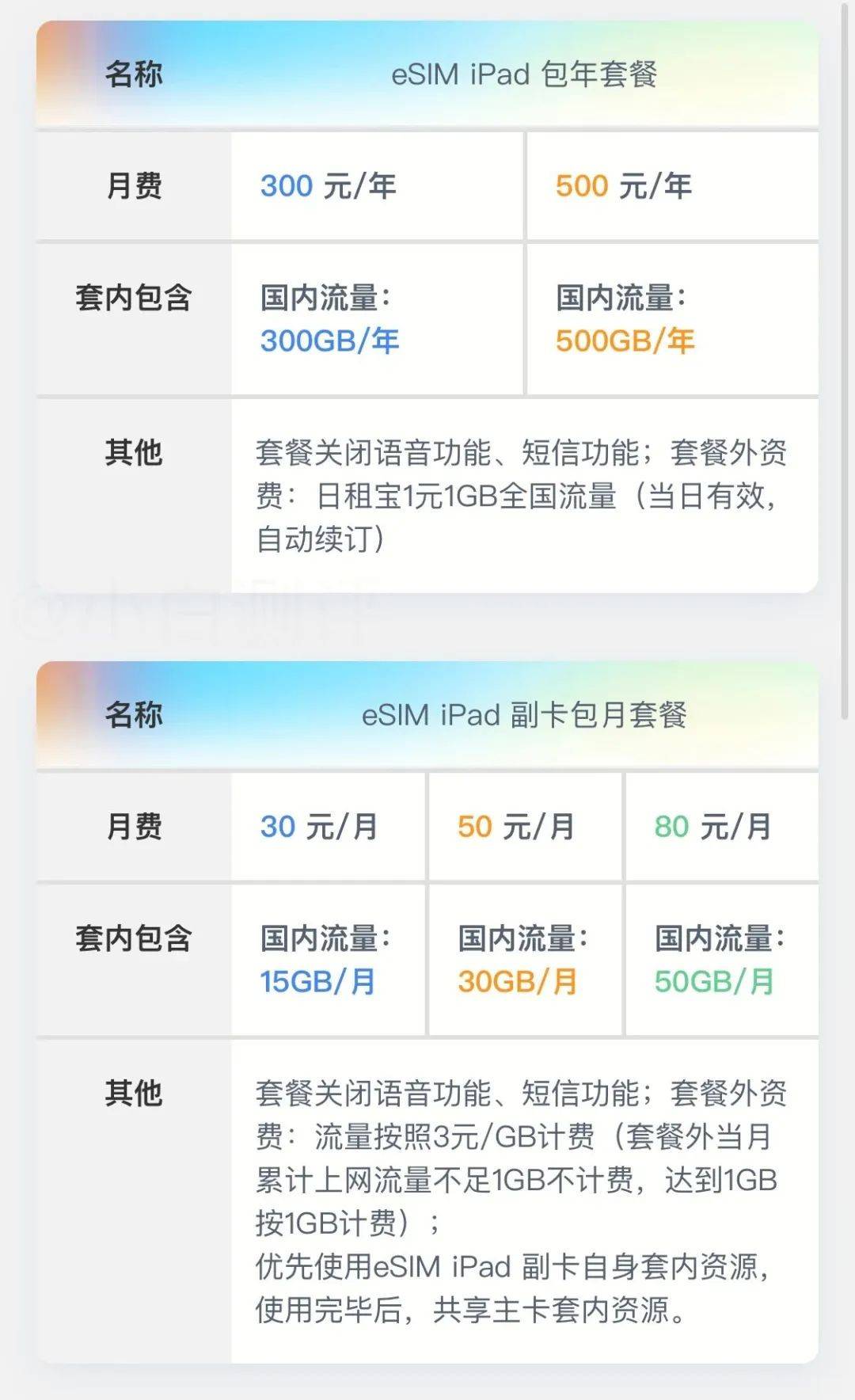 此外,联通还提供ipad eSIM副卡包月套餐,月租分别为30元、50元和80元,提供15GB/月、30GB/月、50GB/月国内流量,优先使用副卡自身流量,消耗完后自动消耗主卡流量。