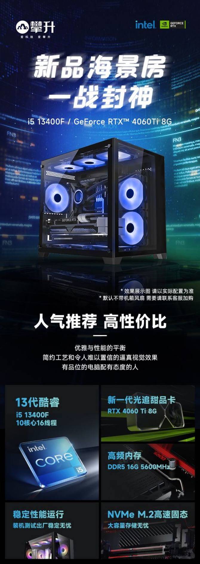 性能配置上,这款主机全系标配了酷睿i5处理器,可选采用了13代酷睿i5 13400F处理器的版本,而显卡方面则全部配备了RTX4060显卡,可选升级至RTX4060Ti版本以获取更高的游戏性能。