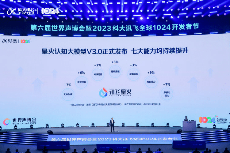 10月24日,第六届世界声博会暨2023全球1024开发者节在安徽合肥开幕。现场,科大讯飞董事长刘庆峰、研究院院长刘聪发布讯飞星火认知大模型V3.0,七大能力持续提升,整体超越ChatGPT,医疗领域超越GPT-4。