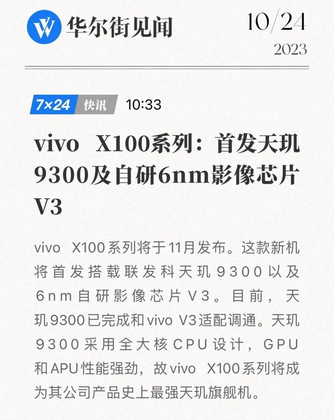 而除了Find X7系列有搭载天玑9300外,华尔街见闻还报道称vivo X100系列将首发搭载天玑9300处理器,目前天玑9300已完成和vivo V3芯片的适配调通,预计11月(中旬)正式和大家见面,后续落地我们也会争取第一时间实测~可以期待下~