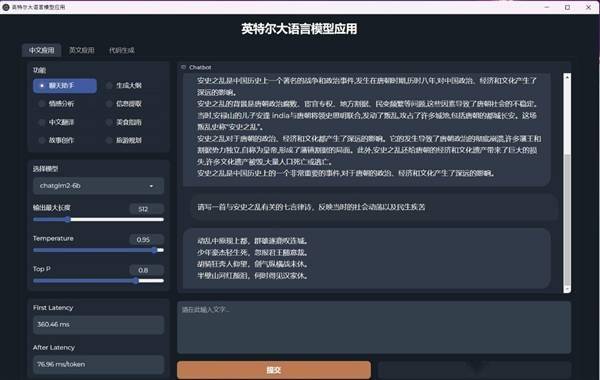 这个DEMO可以选择不同的大语言模型、设定不同的参数,支持中文应用、英文应用、代码生成三大方面,其中中文应用就包括聊天助手、情感分析、中文翻译、故事创作、生成大纲、信息提取、美食指南、旅游规划等八个方面,覆盖日常生活、工作的方方面面。