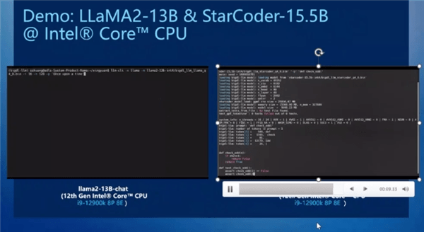 在LLaMA2 130亿参数大语言模型、StarCoder 155亿参数代码大模型上,Intel酷睿处理器也都能获得良好的运行速度。