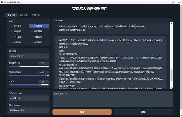 Intel还设计了一个大语言模型DEMO,集成ChatGLM2、LLaMA2、StarCoder,通过优化和量化操作,在任何基于12/13代酷睿的PC上都可以快速生成想要的结果,哪怕是轻薄本。