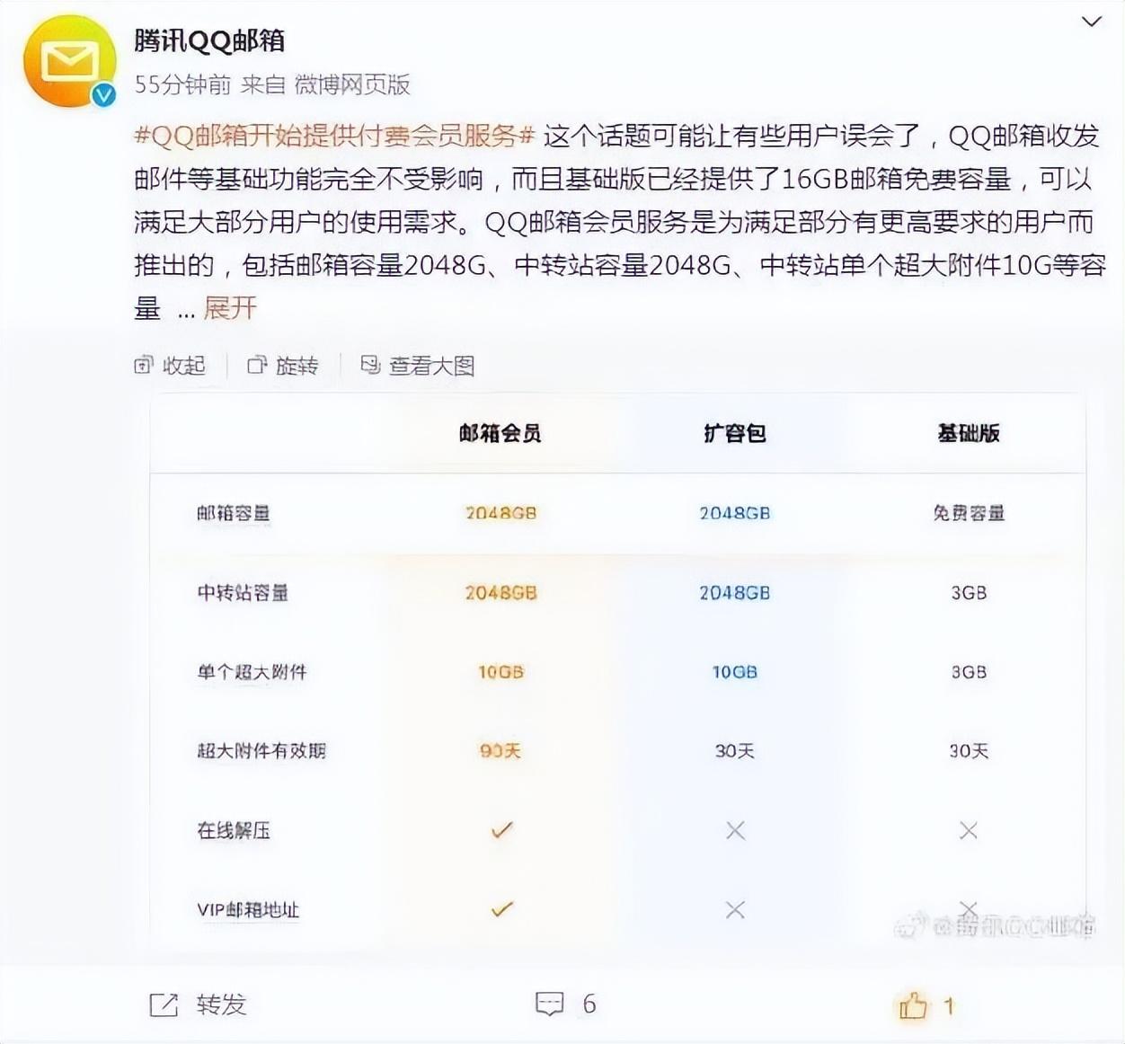 10月23日,#QQ邮箱开始提供付费会员服务#的话题引起网络热议,QQ邮箱微博发文表示可能让有些用户误会了,收发邮件等基础功能完全不受影响,16GB邮箱免费容量可满足大部分用户的使用需求。