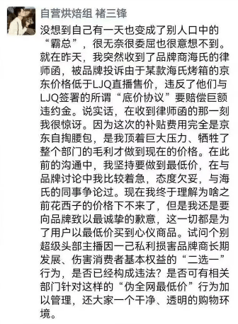 网传一名为“自营烘焙组褚三锋”的疑似京东员工在朋友圈表示,“现在我终于理解为啥之前花西子的价格下不来了”,“试问个别超级头部主播因一己私利损害品牌商长期发展、上海消费者基本权益的“二选一”行为是否已经构成违法?”