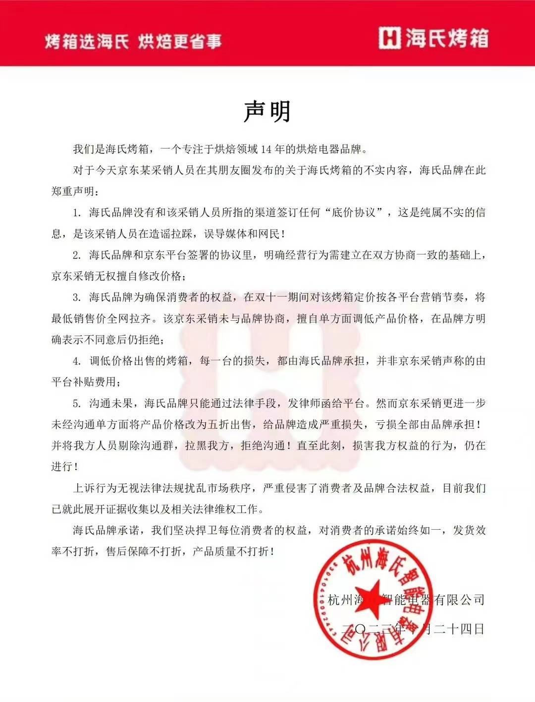 具体来看,声明包含了以下几点:一是没有所谓签订底价协议,二是京东采销擅自修改价格,并在品牌方明确表示不同意后仍拒绝修改,品牌方发律师函后进一步将价格调低至5折出售,还将品牌方拉黑;三是调低价格带来的损失并非平台补贴,而是海氏品牌承担。