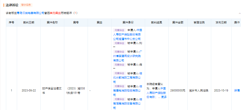 根据公开资料显示,今年9月,庞喜存、青岛汉尚电器有限公司以及其他12家企业、个人因为一起财产保全案,共同被冻结共2900万元。