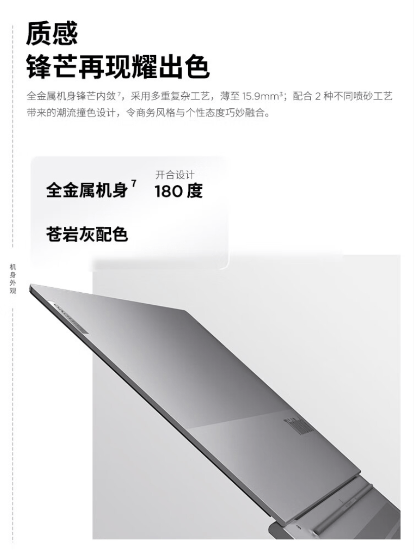 设计上,ThinkBook 14+2023 锐龙版采用“苍岩灰”配色,使用全金属机身,号称薄至 15.9mm,轻至 1.4 千克,可实现 180 度开合。
