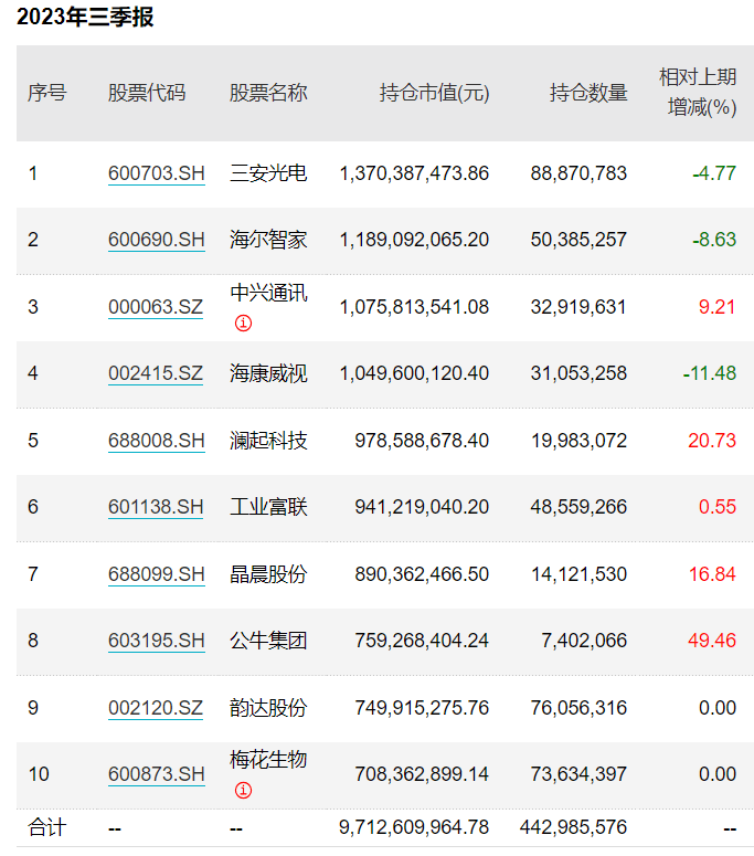 持仓方面,从其管理规模较大的两只基金来看,首先是,三季度主要减持了三安光电、海尔智家、海康威视,持仓增加的是、、工业富联、晶晨股份、公牛集团。