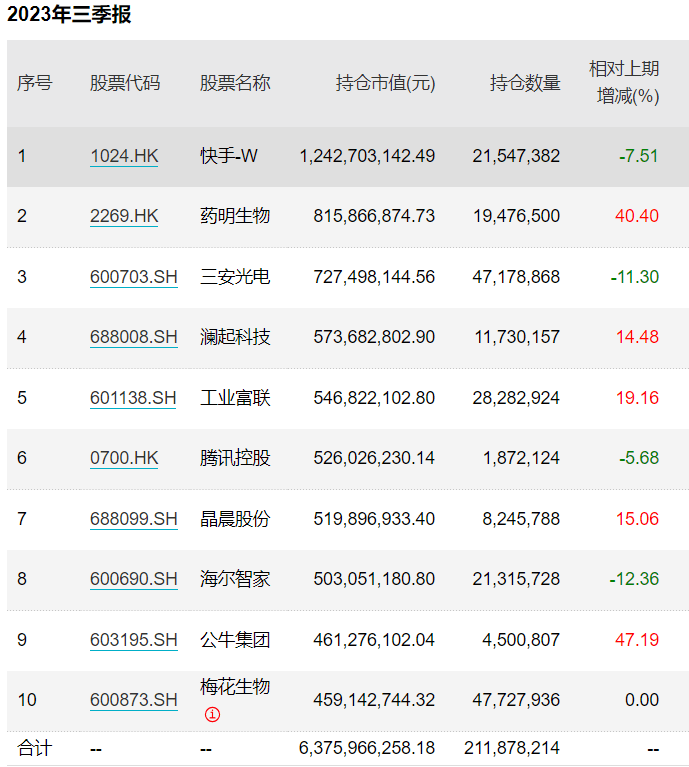 其次是兴全合宜,三季度主要减持了快手-W、三安光电、海尔智家、腾讯控股,持仓增加的主要是药明生物、公牛集团、晶晨股份等。