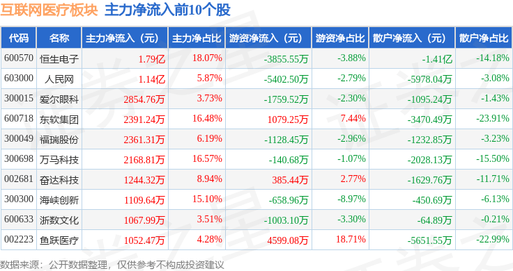 从资金流向上来看,当日互联网医疗板块主力资金净流出2.55亿元,游资资金净流入2.79亿元,散户资金净流出2391.25万元。互联网医疗板块个股资金流向见下表:
