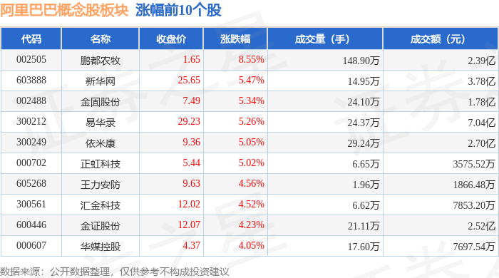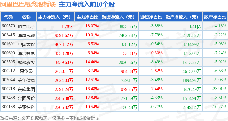 从资金流向上来看,当日阿里巴巴概念股板块主力资金净流出8.02亿元,游资资金净流入2.3亿元,散户资金净流入5.72亿元。阿里巴巴概念股板块个股资金流向见下表: