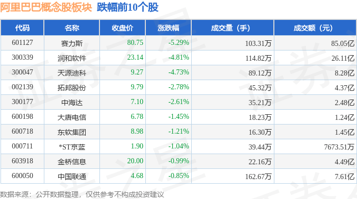 北向资金方面,当日阿里巴巴概念股板块北向资金持股市值为2103.71亿元,减持8.51亿元。其中增持最多的是赛力斯,增持了0.99亿元。减持持最多的是恒生电子,减持了2.2亿元。阿里巴巴概念股板块北向资金持股变动明细见下表: