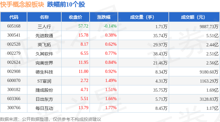 北向资金方面,当日快手概念股板块北向资金持股市值为45.49亿元,增持0.81亿元。其中增持最多的是天娱数科,增持了0.35亿元。减持持最多的是万兴科技,减持了0.89亿元。快手概念股板块北向资金持股变动明细见下表: