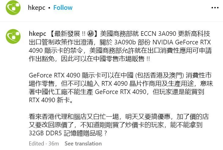 就在10月18日,有部分玩家发现,英伟达的相关电商平台,开始成批量的下架RTX4090显卡,这一下子让整个游戏玩家圈子炸开了锅,随后其他相关合作商的RTX4090显卡都处于断货状态,要么就是直接下架了。至于第三方的店铺里,RTX4090倒是还有货,只是价格从最开始的一万多瞬间飙升到了三万多,甚至还不一定有货。