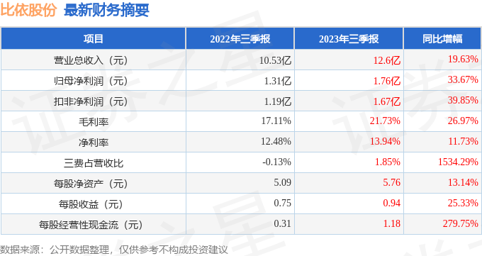据证券之星公开数据整理,近期比依股份(603215)发布2023年三季报。根据财报显示,本报告期中比依股份营收净利润双双增长,三费占比上升明显。截至本报告期末,公司营业总收入12.6亿元,同比上升19.63%,归母净利润1.76亿元,同比上升33.67%。按单季度数据看,第三季度营业总收入4.08亿元,同比上升22.72%,第三季度归母净利润4852.43万元,同比下降12.49%。