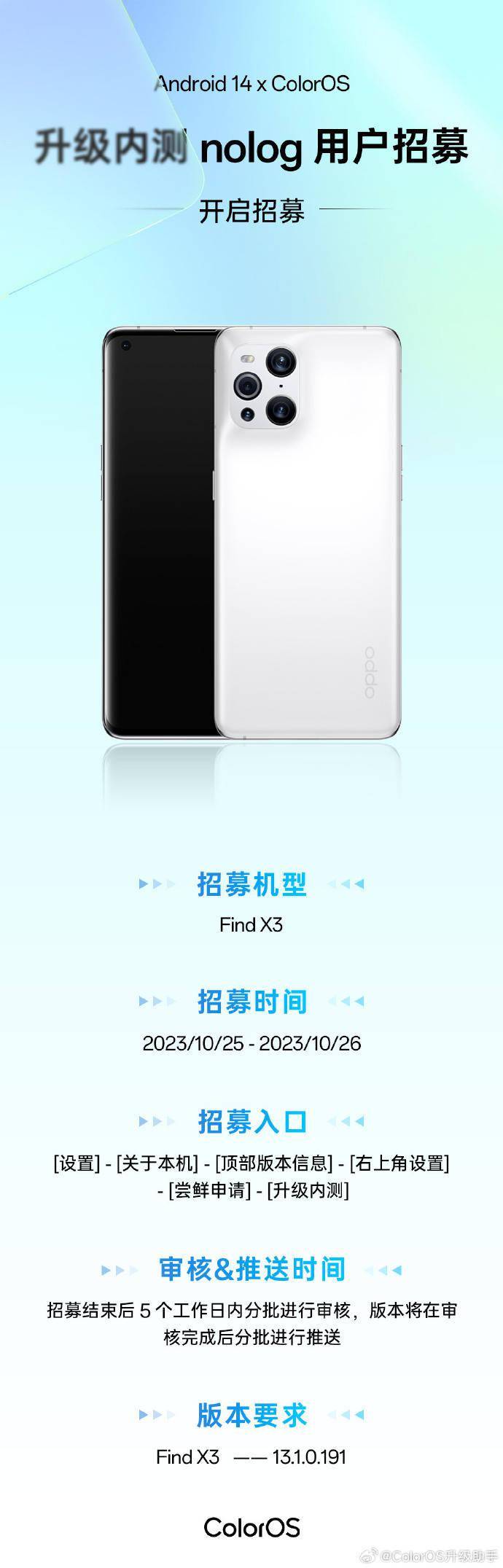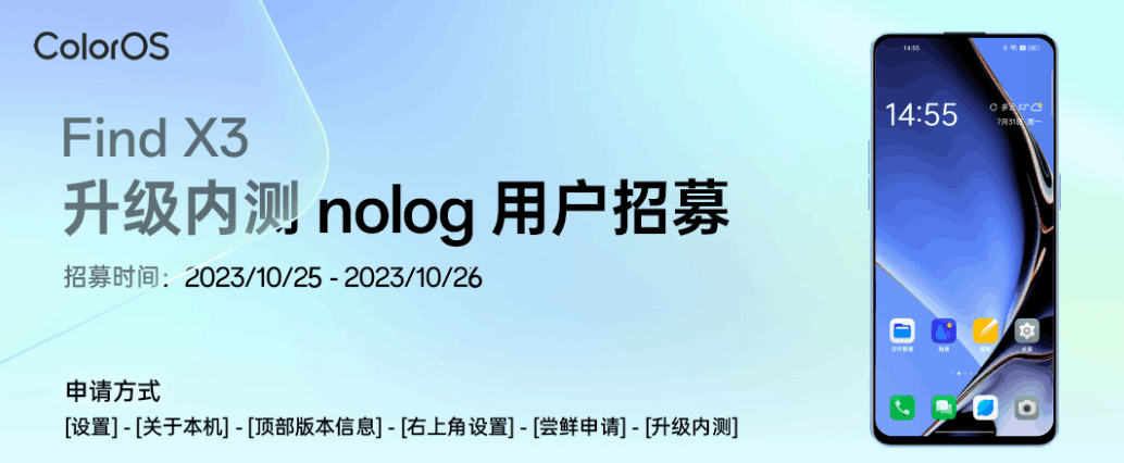 IT之家 10 月 25 日消息,OPPO 今日宣布,OPPO Find X3 手机现已开启 ColorOS 14 x 安卓 14 内测 nolog 招募,报名时间为 10 月 25 日到 10 月 26 日。