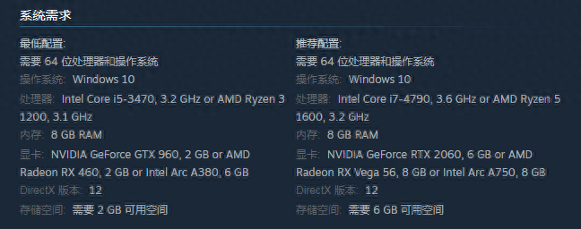 显卡: NVIDIA GeForce RTX 2060, 6 GB or AMD Radeon RX Vega 56, 8 GB or Intel Arc A750, 8 GB