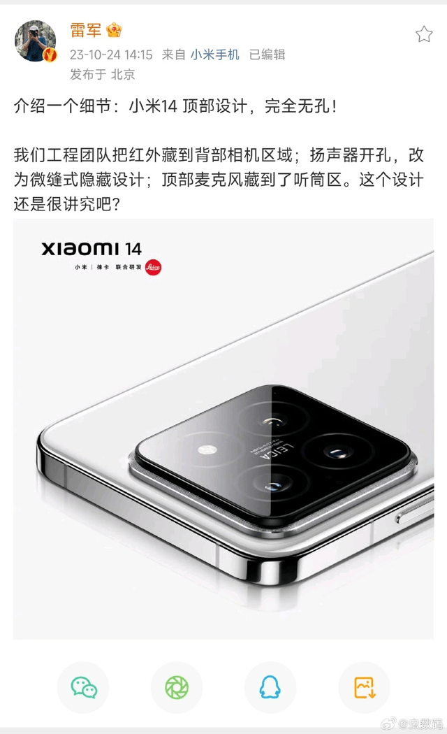 让人感到惊讶的是,小米14借鉴了巴黎饰钉纹的设计理念,但并没有那么显眼,进一步增强了整机的质感,还讲手机顶部完全无孔化,使得边框看上去更加简洁。据了解,工程师们将顶部的红外设备隐藏在手机背部的相机区域,使用微缝式隐藏设计替换了原有的扬声器开孔,而顶部的麦克风则被嵌入到了听筒区域。
