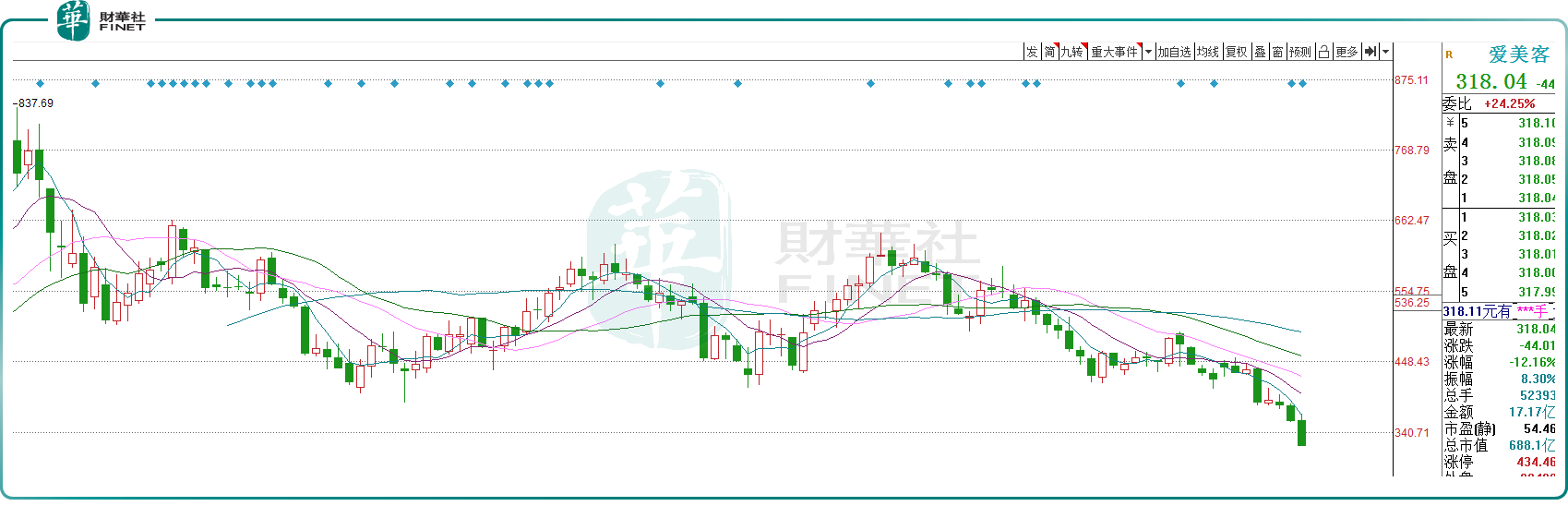 即便如此呵护股价,也无法阻挡爱美客跌跌不休的态势,10月25日,公司报收318.04元/股,总市值688.1亿元,年初至今股价累计跌幅达43.38%。