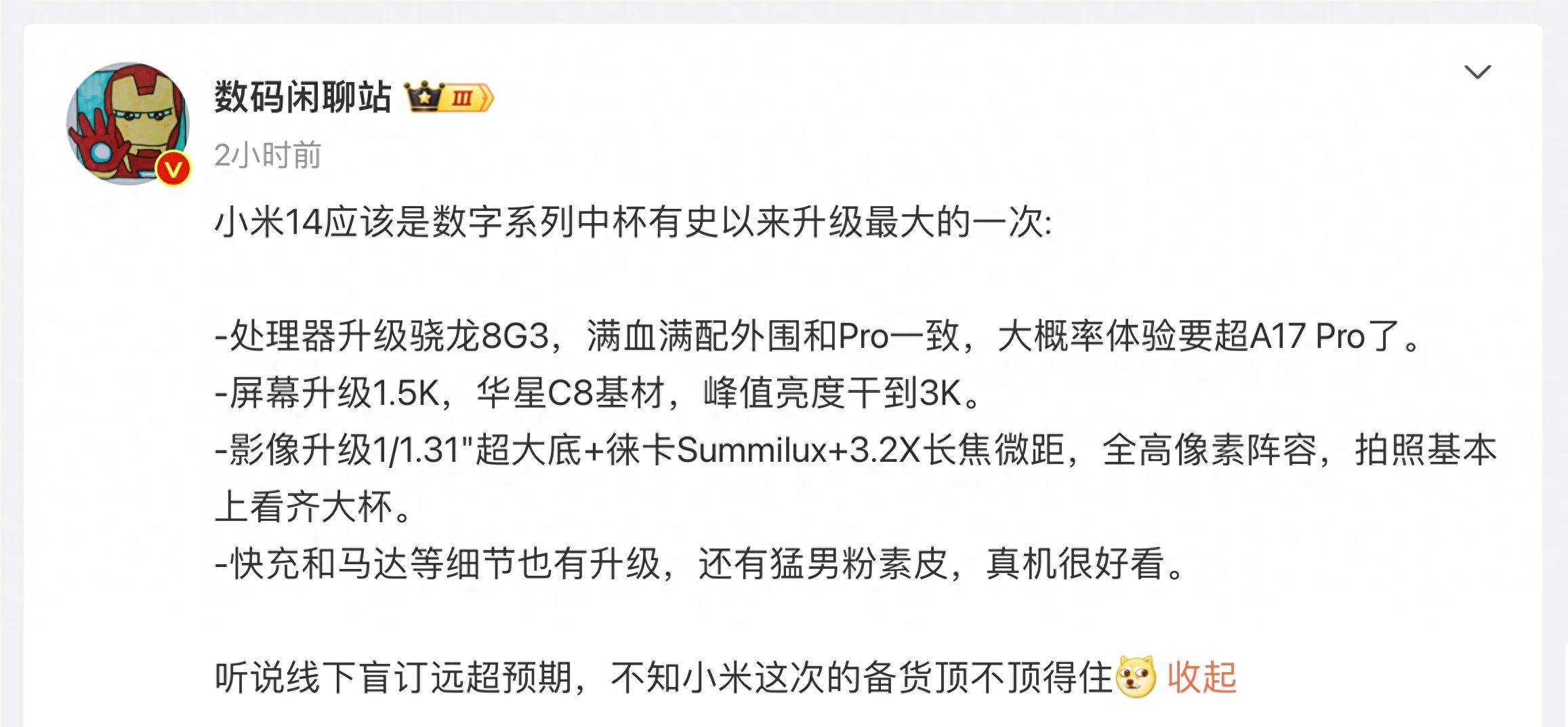 随着小米13的成功,大家就对小米14充满了期待,希望雷军可以带来更多的惊喜,让用户可以用不错的价格拥有更极致的体验。此前,小米14已经公布了外观,顶部完全无孔的设计和全球最窄的下巴,直接就引发了不少用户的喜欢。事实上,小米14在体验上更是迎来了跨越式升级。