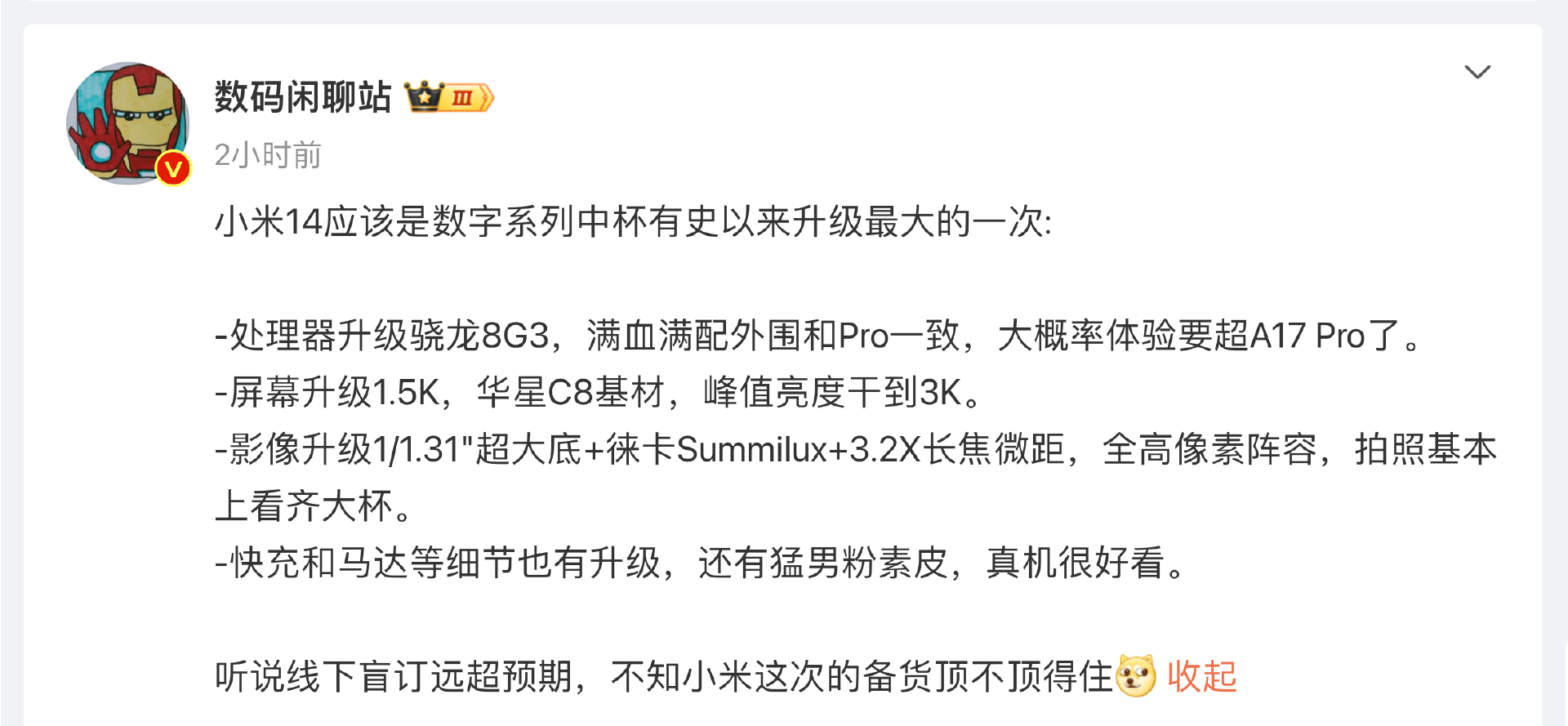 事实上,上一代的能效和性能表现就已经很好了,而骁龙8Gen3在能效方面则有了更大的进步,性能强劲,不夸张的说,搭载骁龙8Gen3的小米14系列,基本可以提前锁定“年度最强旗舰”,就连数码闲聊站也说了,这将是小米史上最强的数字旗舰。