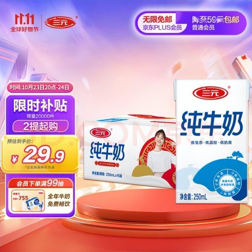 比如,大家日常喝的牛奶,现在京东超市11.11就是最低的。三元方白纯牛奶16礼盒装才29.9元,其他电商一般要39.9元起,一箱至少便宜10块钱!