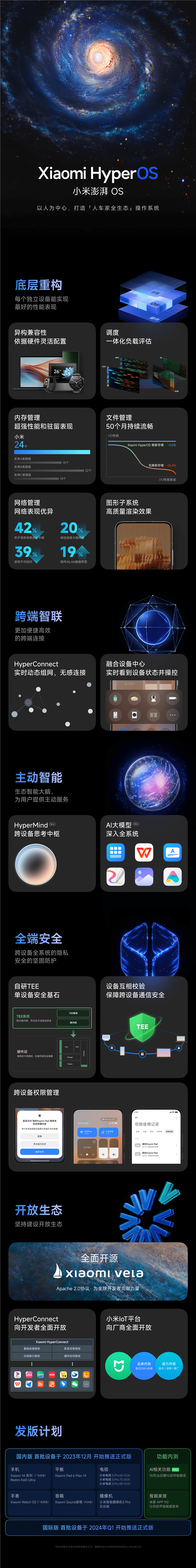 澎湃OS融合Linux和Xiaomi Vela,重建内核基础模块,包含全新8大子系统,构建主动智能、高性能、安全的系统中台,采用全新跨端互联框架,设备动态组网,能力无缝协同。