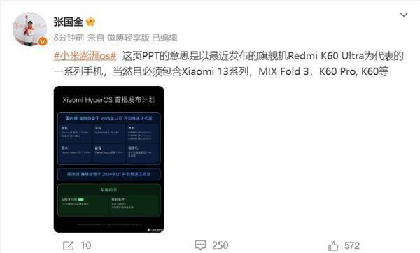 ps.小米手机系统软件部总监张国全表示,这页PPT的意思是以最近发布的旗舰机Redmi K60 Ultra为代表的一系列手机,当然且必须包含Xiaomi 13系列,MIX Fold 3,K60 Pro, K60等 。