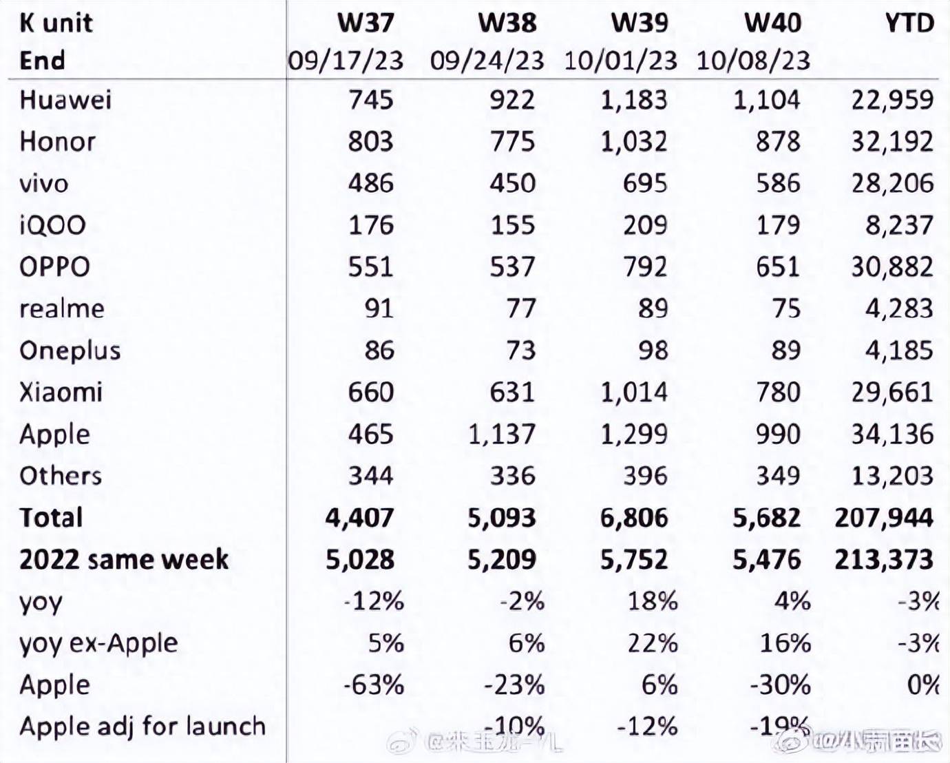 在华为Mate60的带动下,其周销量数据也在继续稳定增长。从日前业内渠道公布的周销量数据来看,华为已开始稳居榜首了,华为+荣耀份额差不多35个点了,而苹果的跌幅则非常明显。