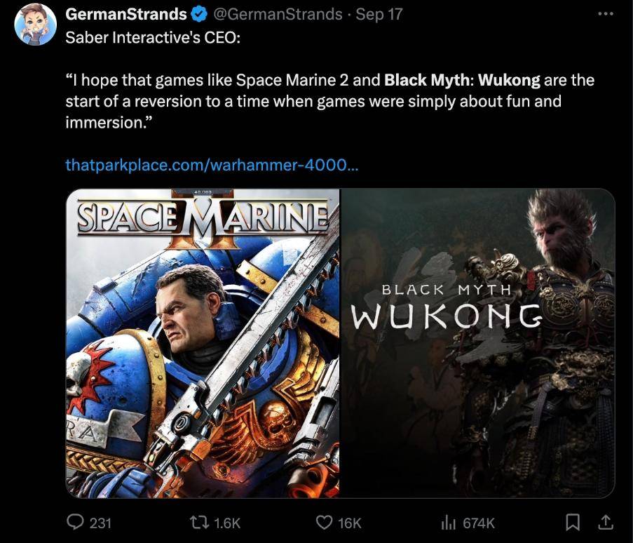 (Saber CEO: 我希望《战锤40K:星际战士2》和《黑神话:悟空》能够引领游戏回归到单纯追求乐趣和沉浸感的时代)