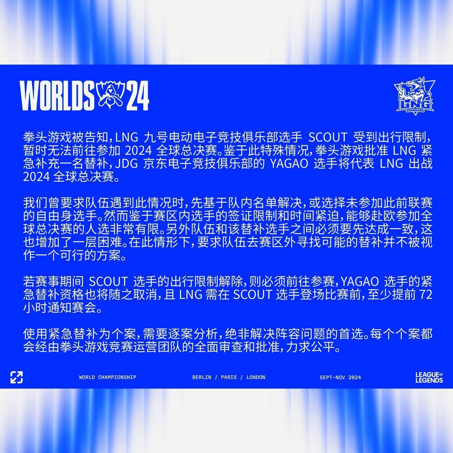 若赛事期间 Scout 选手的出行限制解除,则必须前往参赛,Yagao 选手的紧急替补资格也将随之取消,且 LNG 需在 Scout 选手登场比赛前,至少提前 72 小时通知赛会。