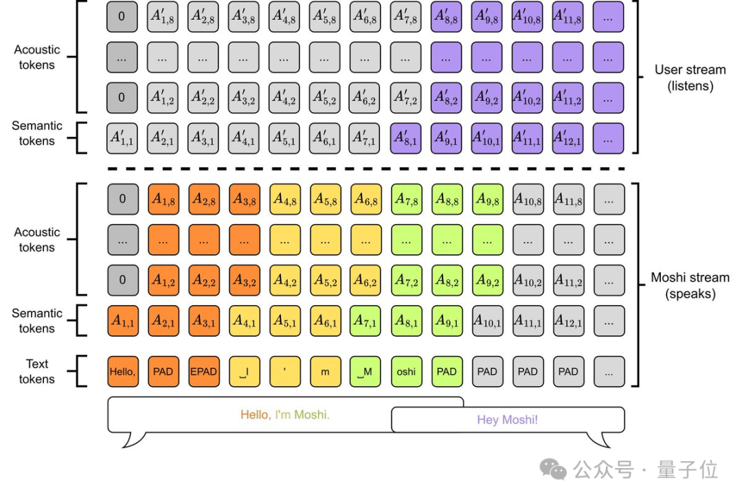 能够在每个时间步中堆叠Moshi和用户的tokens,以模拟全双工对话的动态,包括重叠、反向通道和中断等。