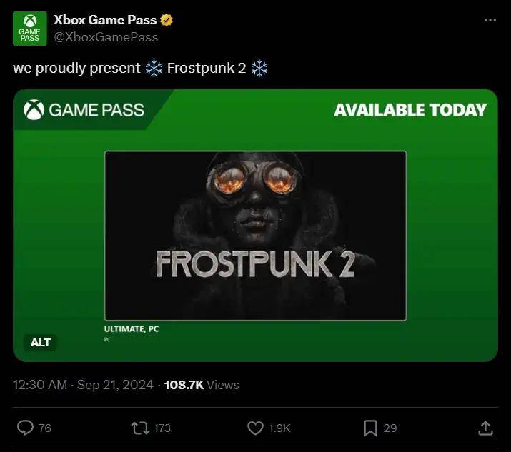 由于《冰汽时代2》首发就进入了微软9月下旬的西瓜皮阵容,因此Xbox Game Pass也大方地说:“我们自豪地向玩家们介绍《冰汽时代2》!”