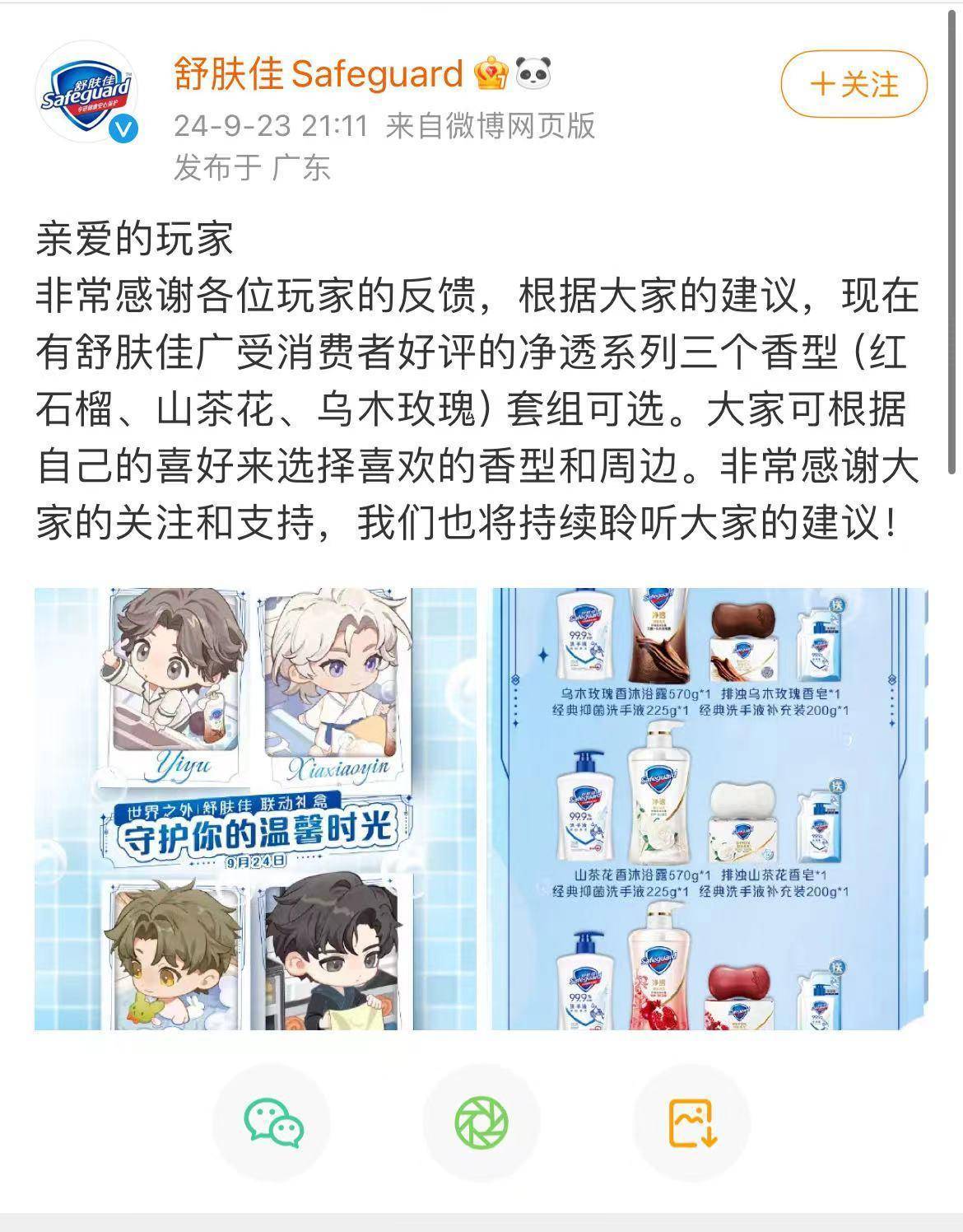 9月23日晚,舒肤佳官方微博发文称,感谢各位玩家的反馈,根据大家的建议,现在联名产品增加至三个香型,消费者可根据自己的喜好来选择喜欢的香型和周边。舒肤佳表示,将持续聆听大家的建议。