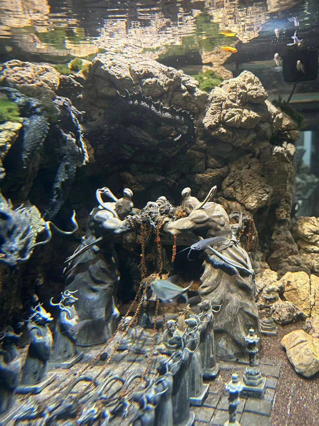 鱼缸正中一块凸起的石头,一猴手持金箍棒独立其上,和四尊压迫感十足的四大天王呈现出对峙的姿态,完美再现了《西游记》原著中“黄风滚滚遮天暗,紫雾腾腾罩地昏”的场景。