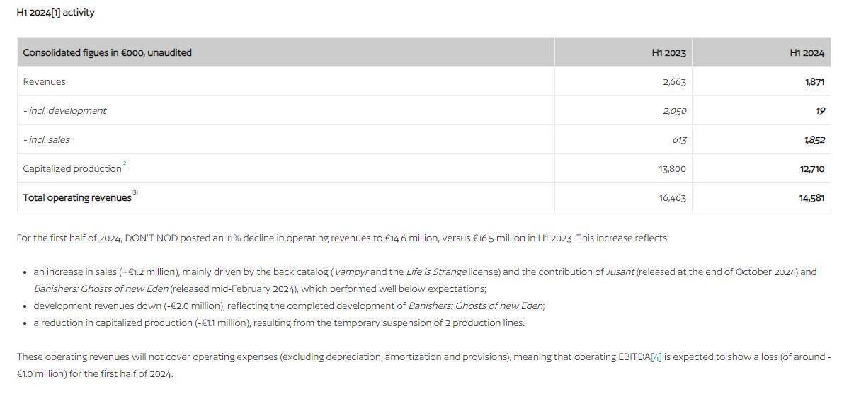 这一消息来自Don't Nod的新闻稿,该公司在新闻稿中向投资者提供了2024年第一季度和第二季度的财务报告。其中,Don't Nod透露该公司未披露的两个项目将重新定位,以吸引更广泛的受众,预计2027年发售,而另外还有两个项目将被无限期搁置。并且,Don’t Nod似乎在另一款新作《Lost Records:Bloom & Rage》中投入了大量资金,对其表现寄予了厚望。