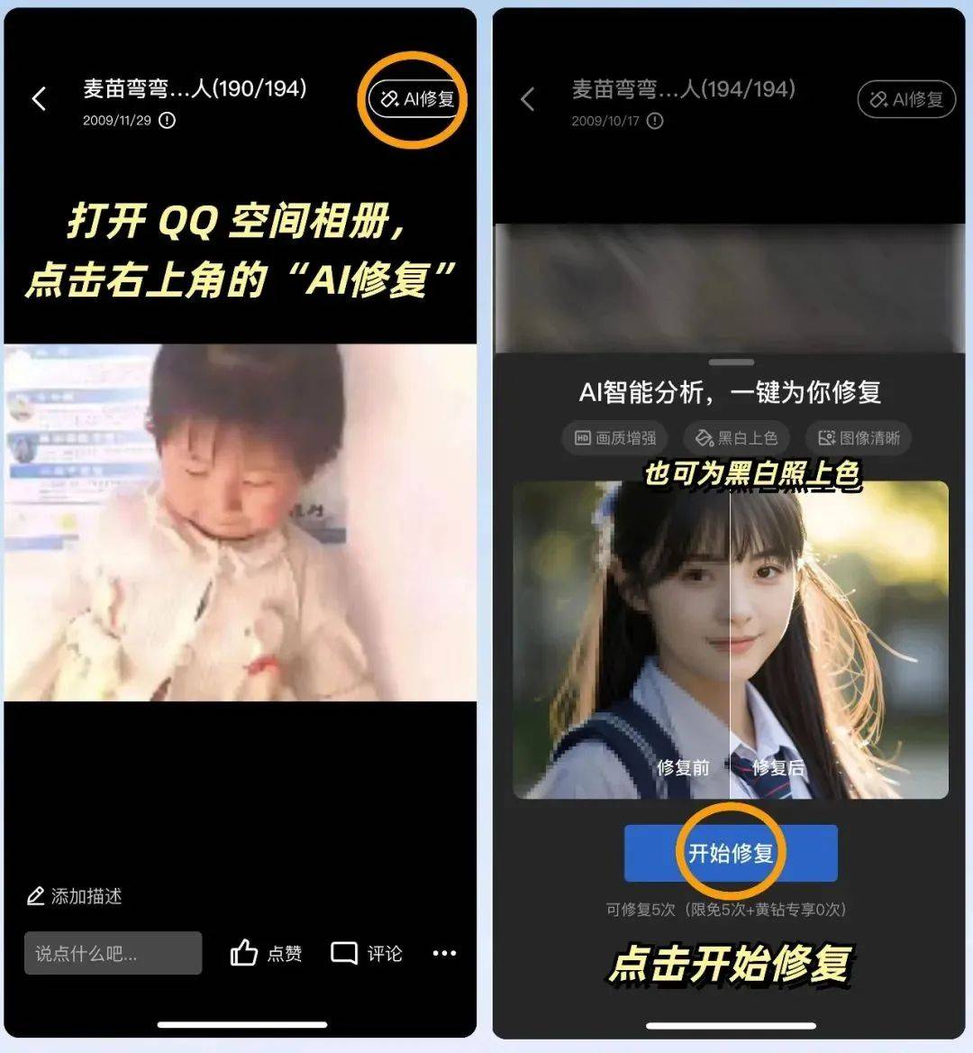 不过手机 QQ 更新到了 9.1.0 版本后,在 QQ 空间相册新增了 AI 照片修复功能,那我们就可以将当年的旧照修复得更加清晰了。