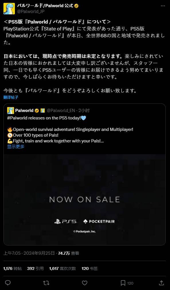 《幻兽帕鲁》官方表示,正如 PlayStation 官方所宣布的那样,PS5 版《幻兽帕鲁》现已登陆全球 68 个国家和地区,但唯独不包括日本本土。