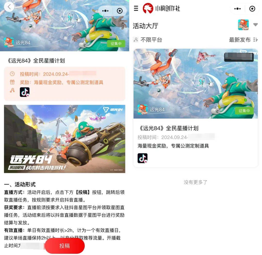 进入“小莉创作社”的小程序,能看到现在正开启的“《远光84》全民星播计划”。感兴趣的玩家可以点击投稿领取直播任务,在抖音按规则开启直播。如能达成相关成绩,平台就会直接发放现金、专属公测定制道具等奖励, 将所谓的“激励内容产出”落实到位。