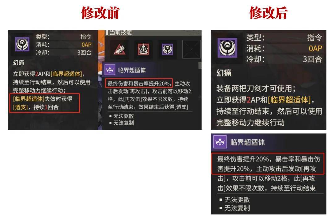 首先第一个比较重要的改动便是将奥菲利亚的核心技能【幻痛】中,使用技能后会获得的1回合“透支”的效果给删除掉了,同时在“超适体”状态中还加入了暴击伤害提升20%的效果,可谓是对这个技能而言的巨大增幅,而有朋友也说这是不是意味着奥菲利亚就真能成为格斗职业中的芙烈达了呢?因为芙烈达的【负载强袭】技能也是3回合冷却和多动嘛,对此维一认为: