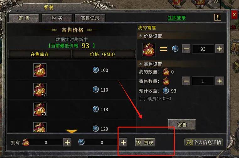 游戏官方自带交易平台,玩家先将元宝兑换成锦囊即可上架寄售,出售后就能直接提现!开启月卡特权的玩家可将赠送的元宝优先出售,前期物价高,可将收益最大化!