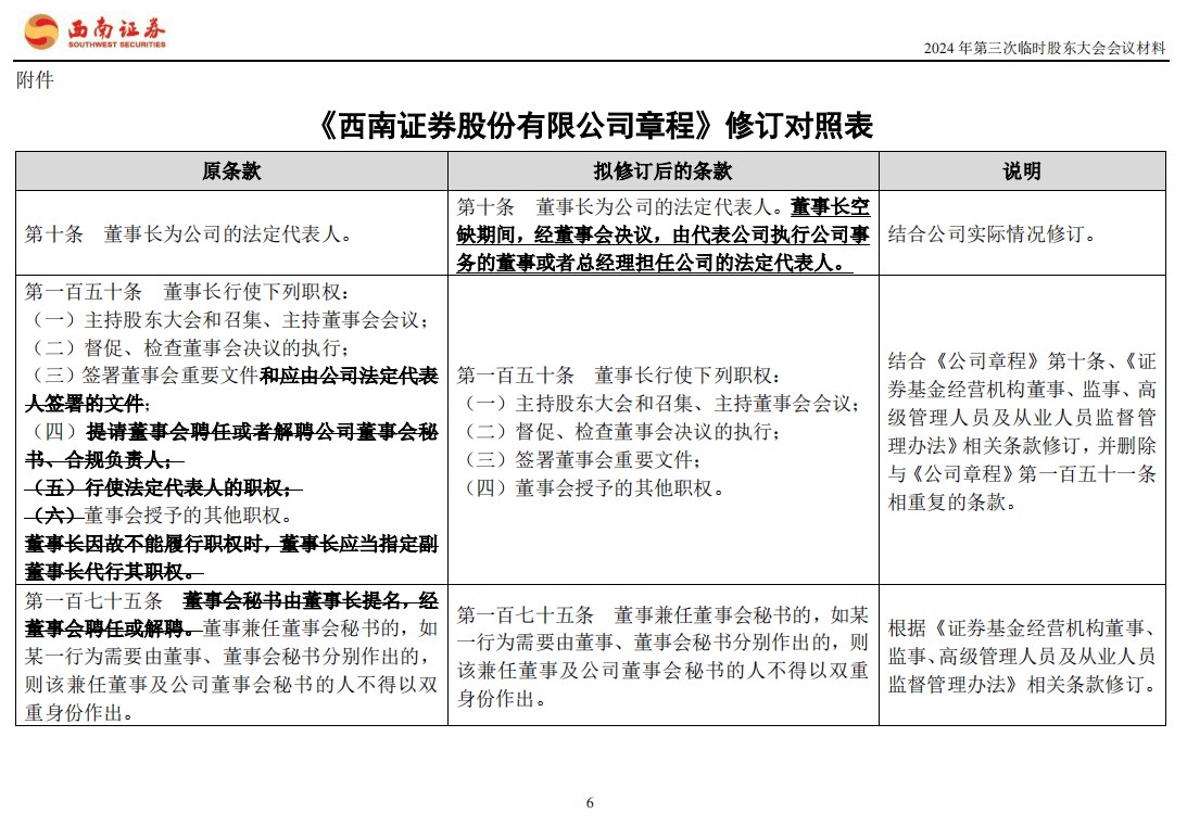 随后,公司很快就启动了修订公司章程的工作。在9月10召开的董事会中,通过了关于修订《公司章程》的议案,同意将议案提交公司股东大会审议。9月26日,西南证券将召开2024年第三次临时股东大会,审议修订公司章程的议案。通过上述修订内容来看,总经理杨雨松在董事长空缺期间代理董事长、法定代表人职责,也将有公司章程作为依据。