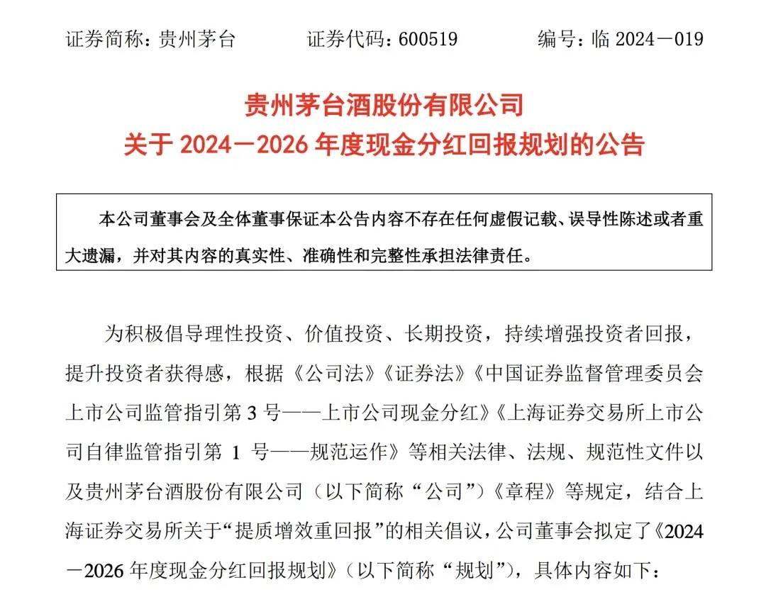 今年8月,贵州茅台发布的《2024-2026年度现金分红回报规划》显示,2024年至2026年度,公司每年度分配的现金红利总额不低于当年实现归母净利润的75%,原则上每年度进行两次分红,股息率超过了3.5%。