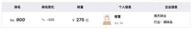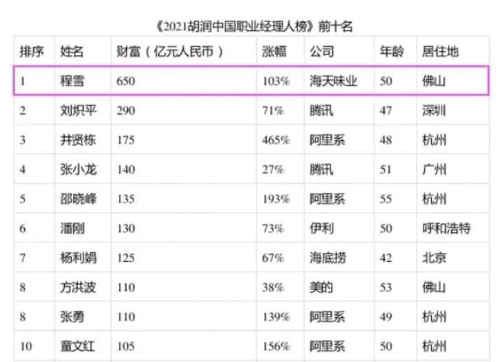 在海天味业股价高峰值时,海天味业前董事长以264亿美元的财富上榜全球富豪榜57位,而程雪则以87亿美元在榜单中位列274位。胡润研究院发布《2021胡润中国职业经理人榜》时,50岁的程雪便以650亿元的财富摘得中国职业经理人首富的桂冠。