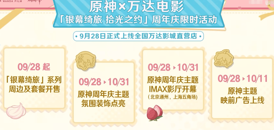 联动方面,在9月28日,原神与万达电影开启的“银幕绮旅·拾光之约”的联动将正式开启。本次活动将上线“银幕绮旅”系列周边、爆米花可乐套餐,全国万达影城直营店还将点亮原神周年庆主题氛围装饰,为原神庆生。想看电影的大家,可以趁着这个机会去了。