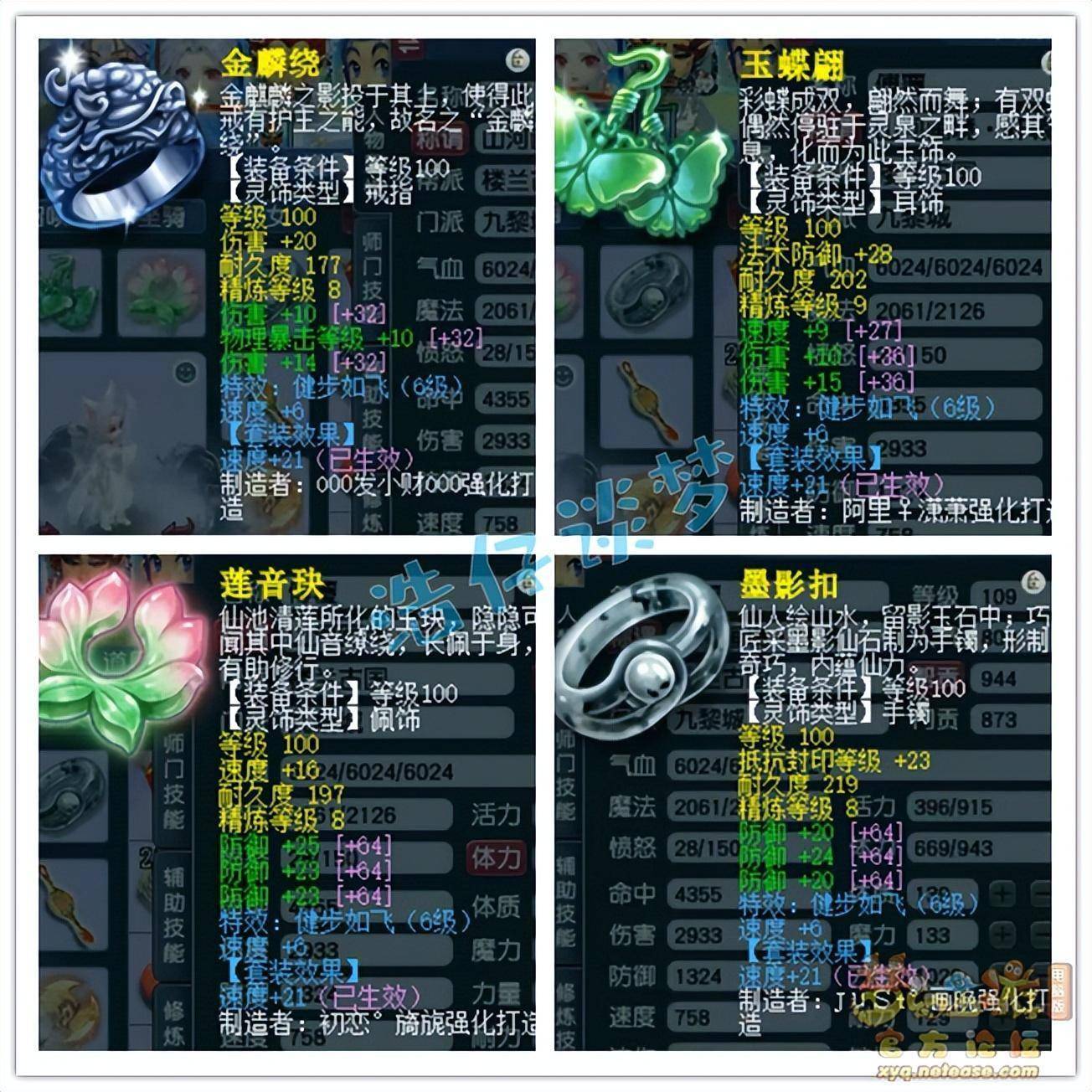 戒指下排双伤害一物暴,耳饰下排双伤害一速度,配饰和手镯下排都是三防御,特效都是6级健步如飞!
